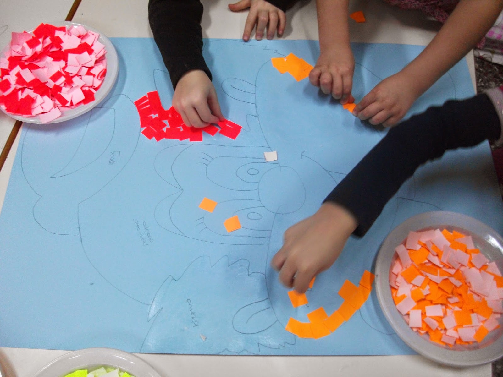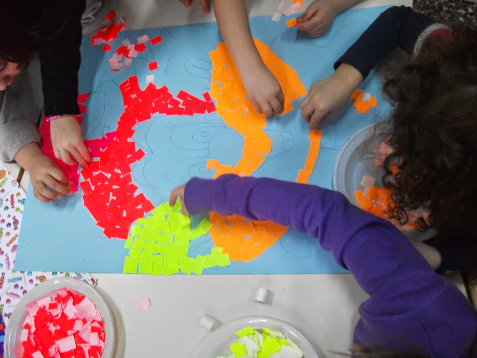 | Αρχίσαμε να κολλάμε ψηφίδες από φωσφορούχο γλασέ χαρτί... |