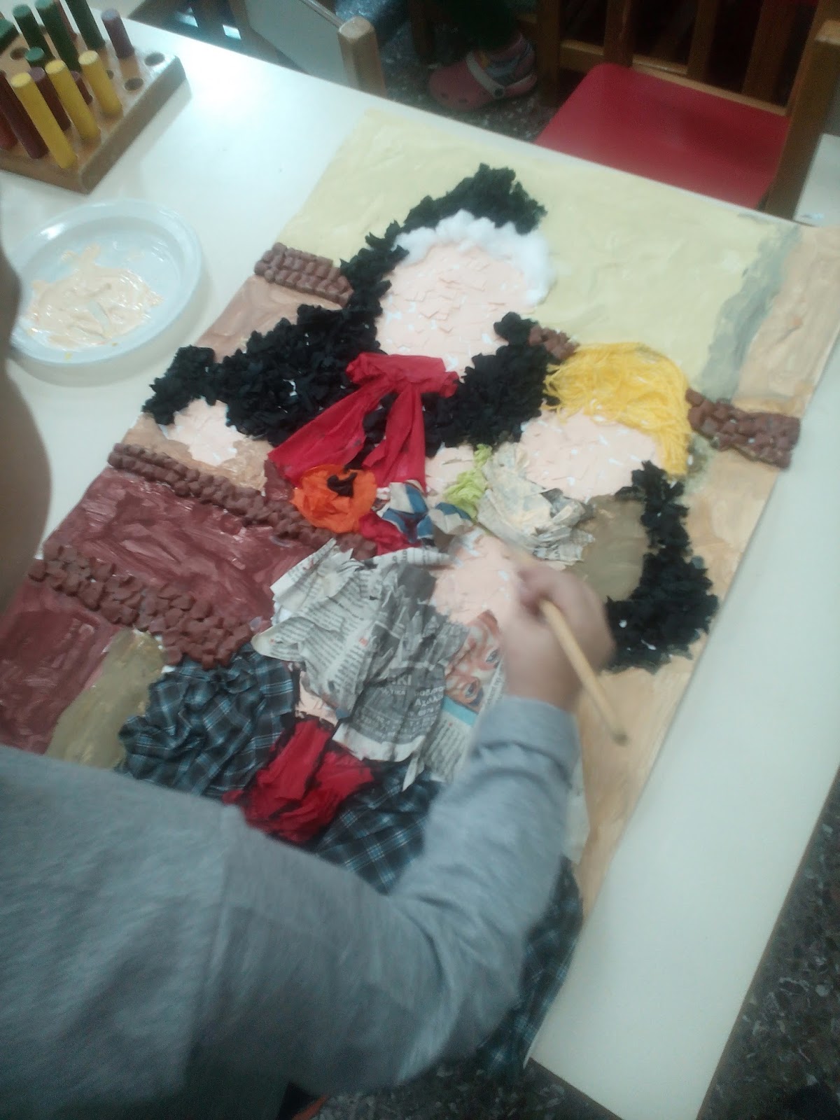 Κολλήσαμε εφημερίδα για το φόρεμα του κοριτσιού και το χρωμάτισαν τα παιδιά με τέμπερα....