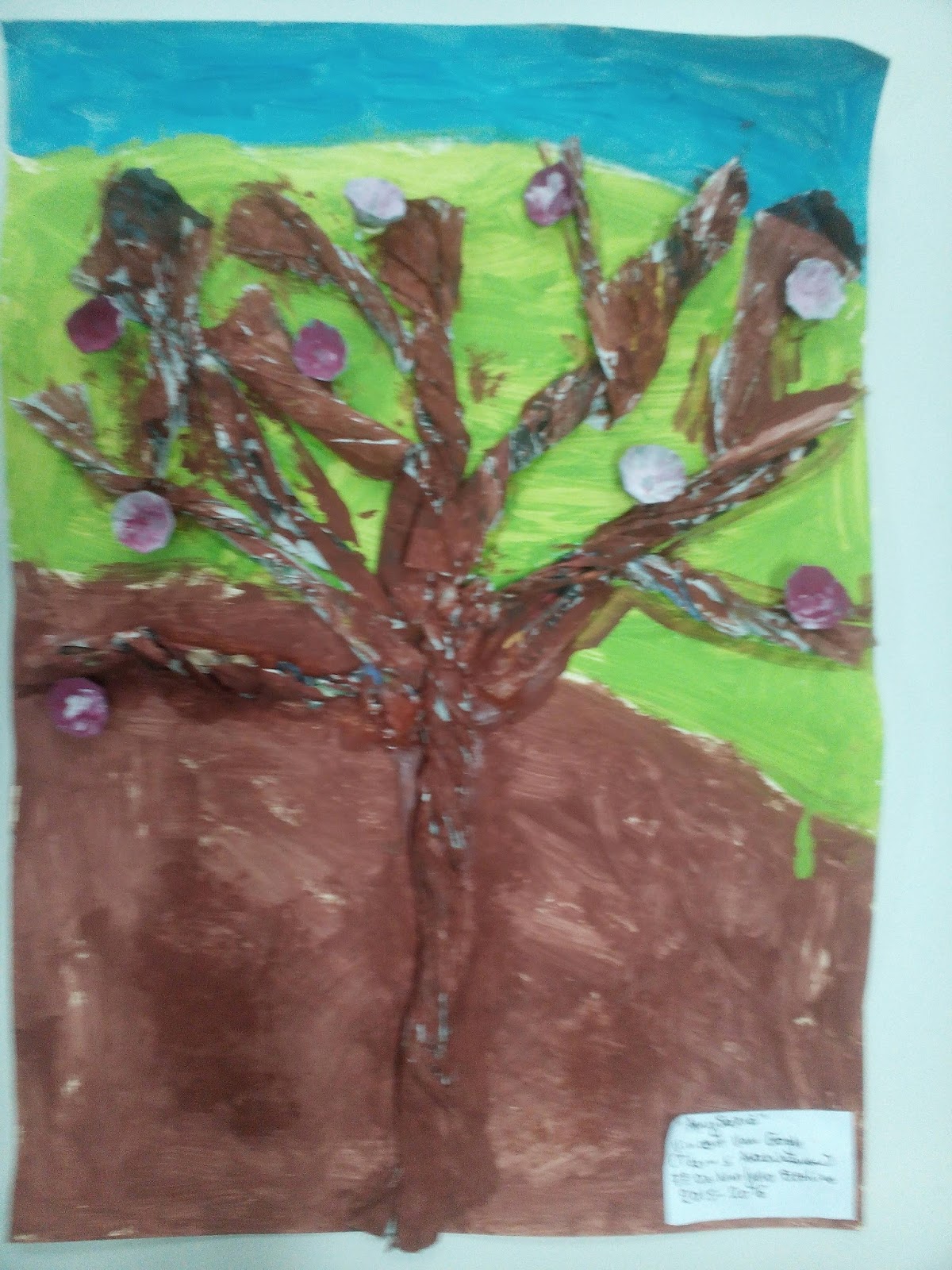 Και αφού αγαπήσαμε τόσο πολύ τον πίνακα του Βαν Γκογκ, σκεφτήκαμε να τον απεικονίσουμε σε μια ομαδική εργασία, φτιαγμένη αποκλειστικά με ανακυκλώσιμα υλικά. Με ατλακόλ και εφημερίδα σχηματίσαμε τον κορμό και στη συνέχεια τα παιδιά έβαψαν κιόλας τον κορμό με καφέ τέμπερα. Τους έκοψα λουλούδια αμυγδαλιάς από αυγοθήκες και τα παιδιά τα έβαψαν με ροζ και λευκή τέμπερα...