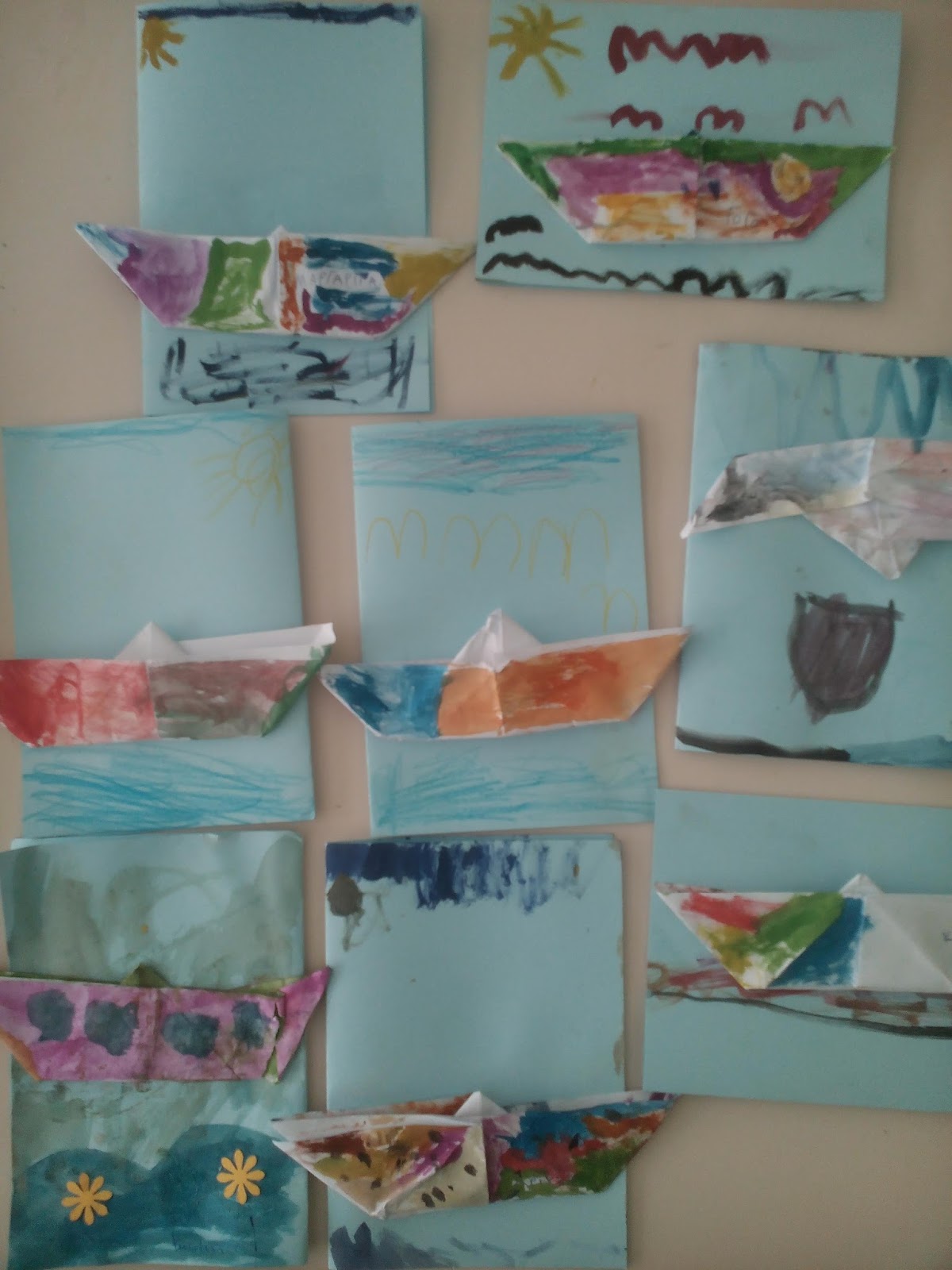 Φέτος διαβάσαμε το "Χάρτινο καραβάκι της μαμάς", με αφορμή τη γιορτή της μητέρας. Με απλά λόγια, καταρρίπτει τον μύθο ότι οι γονείς τα ξέρουν όλα. Αντίθετα, πολλές φορές μαθαίνουν και οι ίδιοι από τα παιδιά τους. Παιδευτήκαμε να μάθουμε κι εμείς να κάνουμε καραβάκια από χαρτί και τα χρωματίσαμε κι εμείς (τα παιδιά εννοείται) με νερομπογιές. Μετά ζωγράφισαν θάλασσα κι έβαλαν μέσα της να ταξιδέψει το καραβάκι τους. Μέσα η κάρτα έγραφε ένα στιχάκι που πρόχειρα έγραψα εκείνη τη στιγμή, εμπνευσμένη από το βιβλίο: