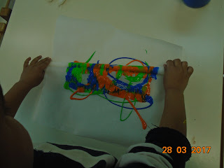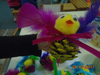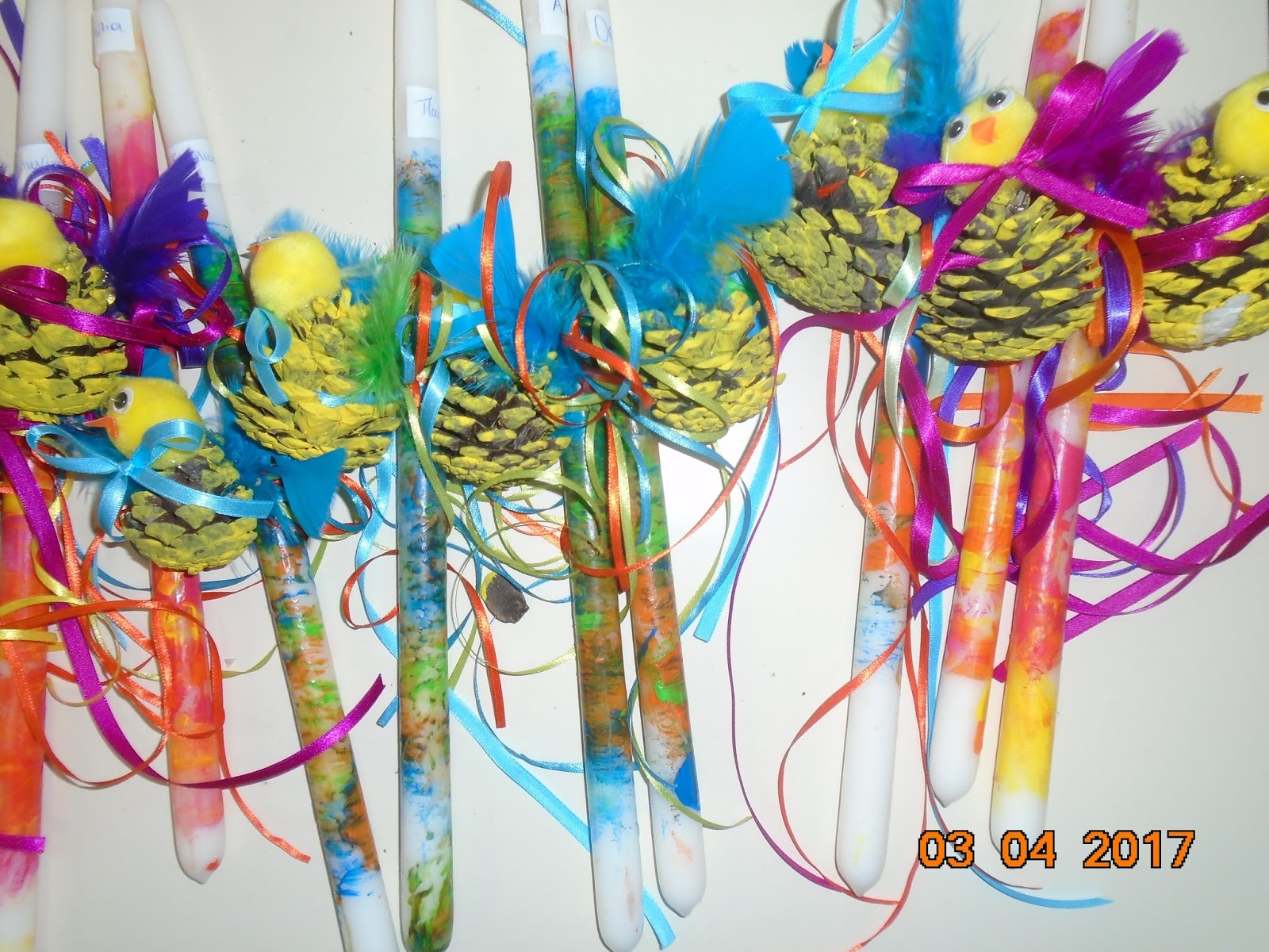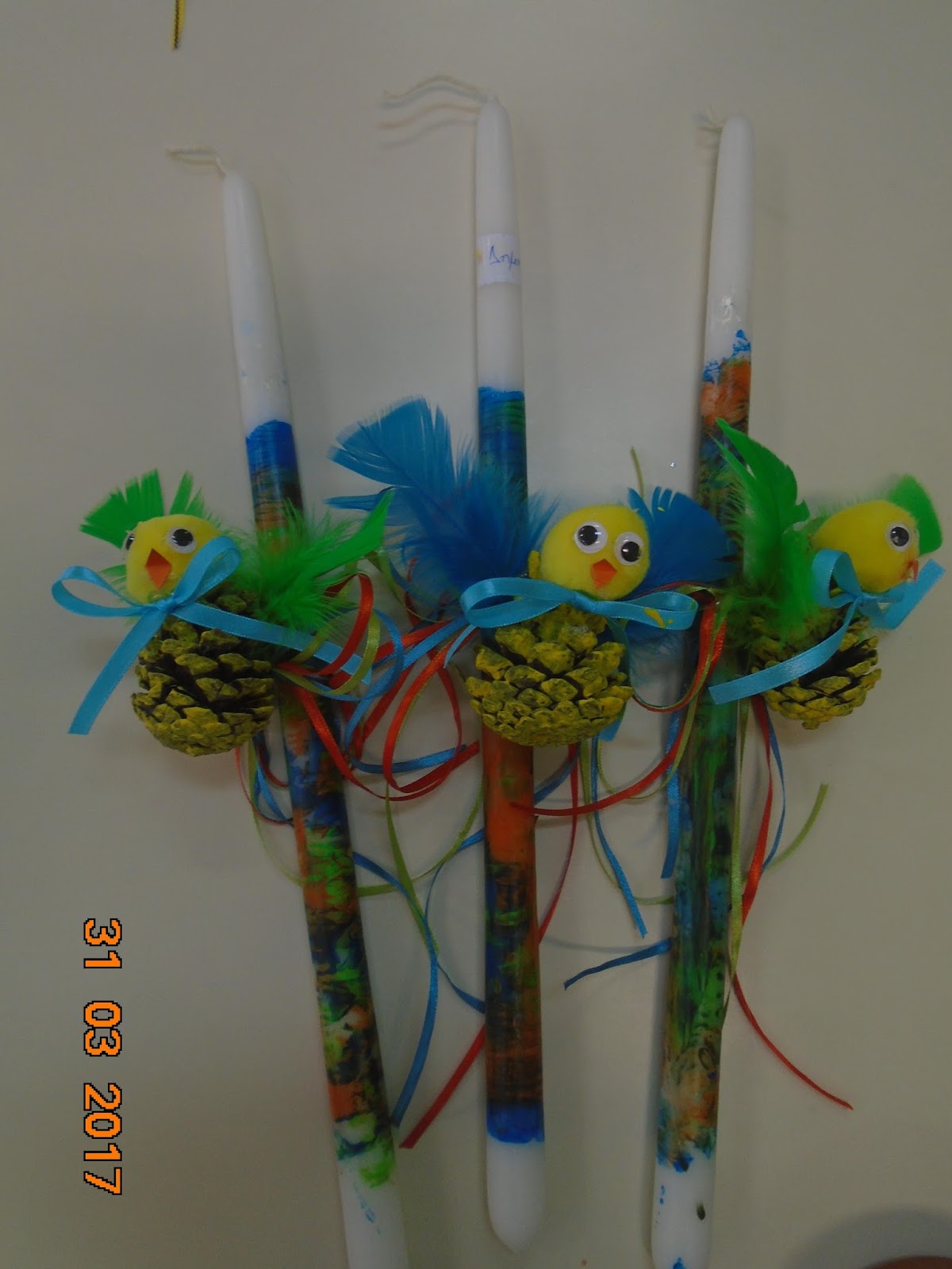 Για τις φετινές μας λαμπάδες ακολουθήσαμε την περσινή μας τεχνική, με τις τέμπερες και την ατλακόλ. Το στολιδάκι μας όμως διαφέρει. Τα παιδιά χρωμάτισαν κίτρινες κουκουνάρες και στη συνέχεια κολλήσαμε κεφαλάκι, φτερά, κορδέλες!