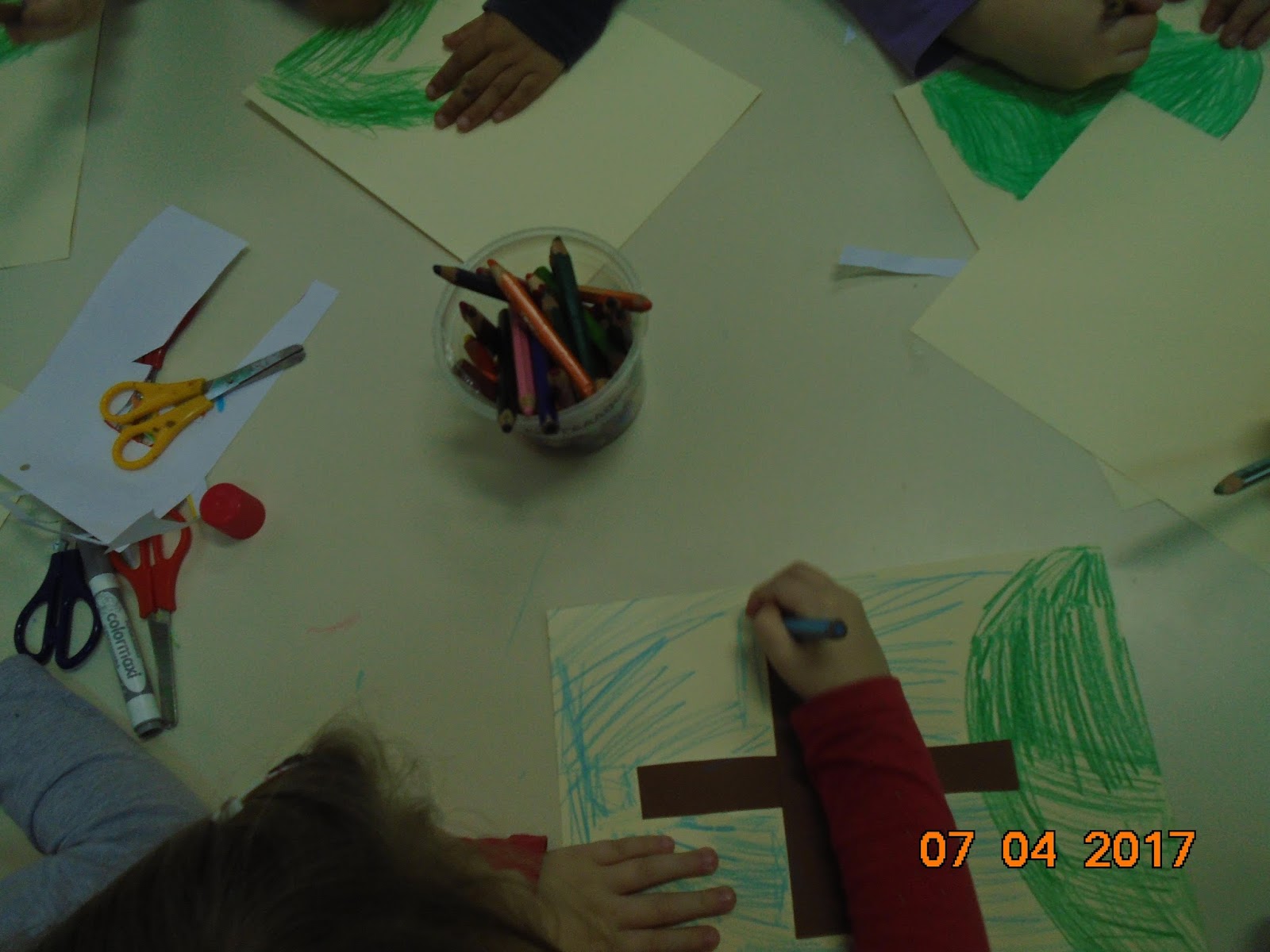 Δύο καφέ λωρίδες , μία μεγαλύτερη, μία μικρότερη , με τις οποίες τα παιδιά έπρεπε να κάνουν τον σταυρό και να τον κολλήσουν.