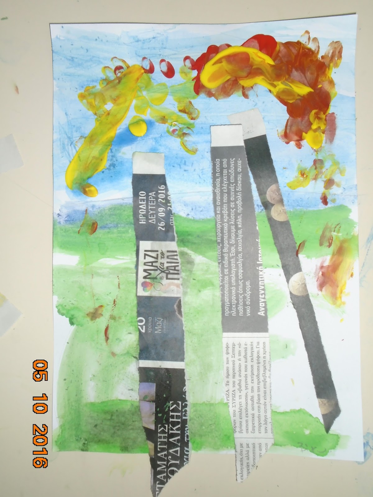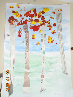 Φθινόπωρο και οι πρώτες μας φθινοπωρινές εργασίες είναι έτοιμες! Και φέτος τα παιδάκια μας άρχισαν να χρησιμοποιούν τα χεράκια τους και να καλλιεργούν τη δημιουργικότητά τους. Με θέμα ο φθινόπωρο δουλέψαμε φθινοπωρινά τοπία. Το φόντο με νερομπογιές, στη συνέχεια κόλλησαν τα παιδιά σκισμένες φημερίδες για κορμούς δέντρων και τέλος χρησιμοποιήσαμε τέμπερες, προκειμένου να κάνουν με τα δαχτυλάκια τους "φύλλα" φθινοπώρου σε χρώματα καφέ, κίτρινο και κόκκινο.