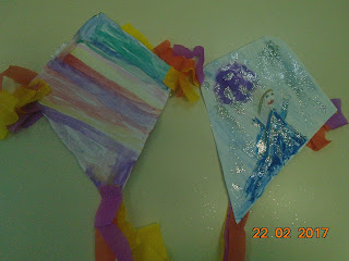 Οι χαρταετοί μας αυτοσχέδιοι και ζωγραφισμένοι από τα παιδιά με νερομπογιές. Στους χαρταετούς των κοριτσιών βάλαμε και χρυσόσκονη ή ασημόσκονη...