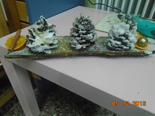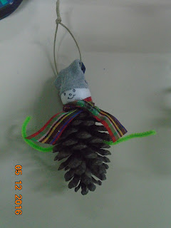 Ένα στολίδι της τελευταίας μέρας..Με κουκουνάρες το τελευταίο στολιδάκι μας για φέτος.. Τα παιδιά έβαψαν με λευκό χρώμα κουκουνάρες, στις οποίες ρίξαμε αμέσως χρυσόσκονη. Κολλήσαμε κεφαλάκι, στολίσαμε με σύρμα πίπας χρυσαφί στεφανάκι. Στο τέλος, κολλήσαμε για φτερά του αγγέλου μας έναν φιόγκο χρυσαφί ή ασημί και ένα λεπτό κορδονάκι γύρα από το λαιμό, για να μπορούν τα παιδιά να το κρεμάσουν στο δέντρο τους. Λαμπερό και απλό!