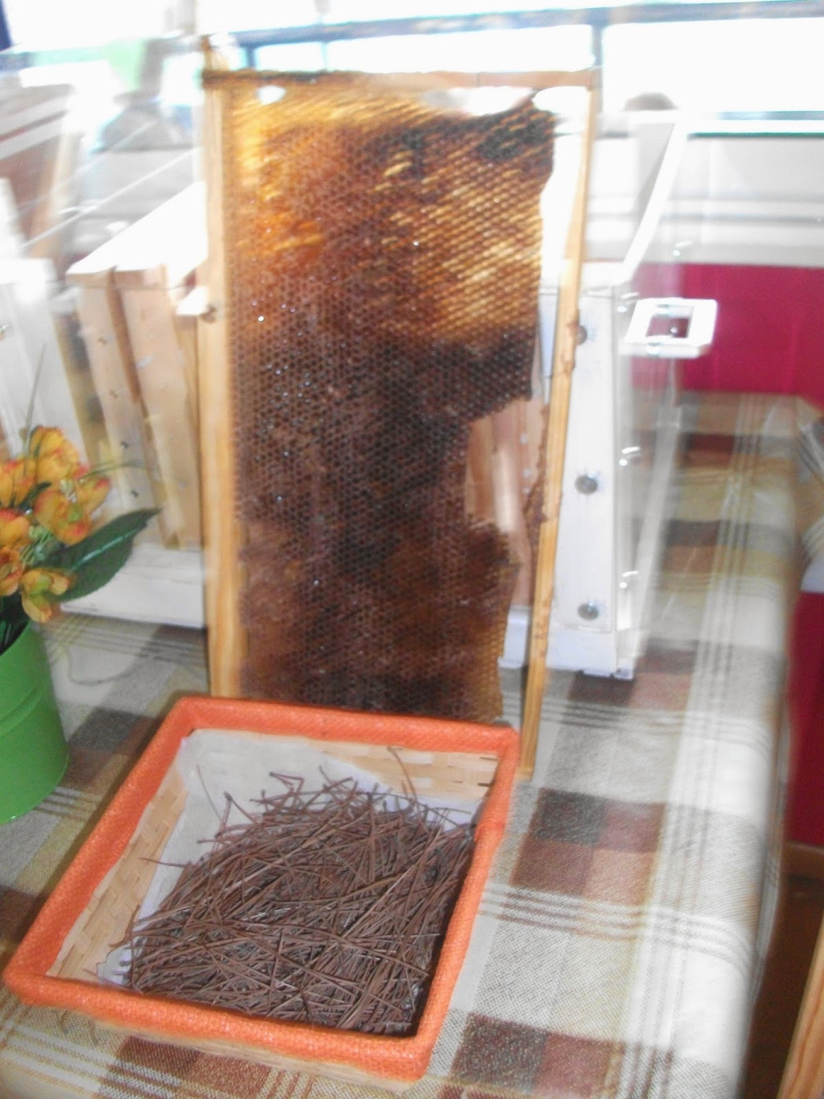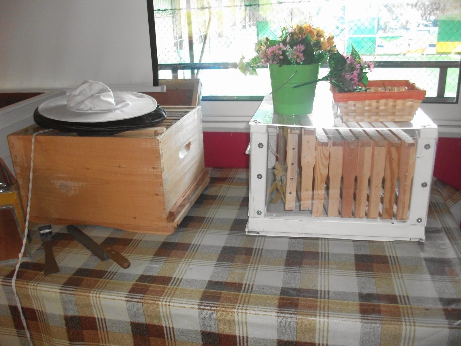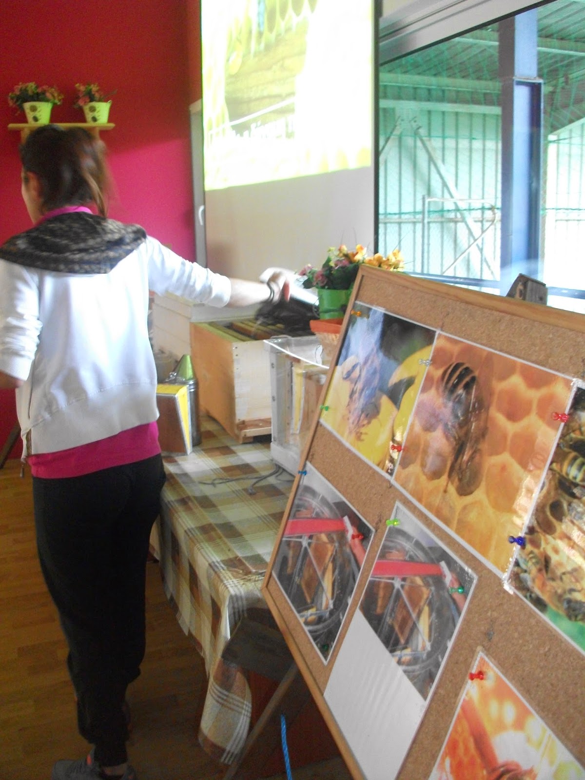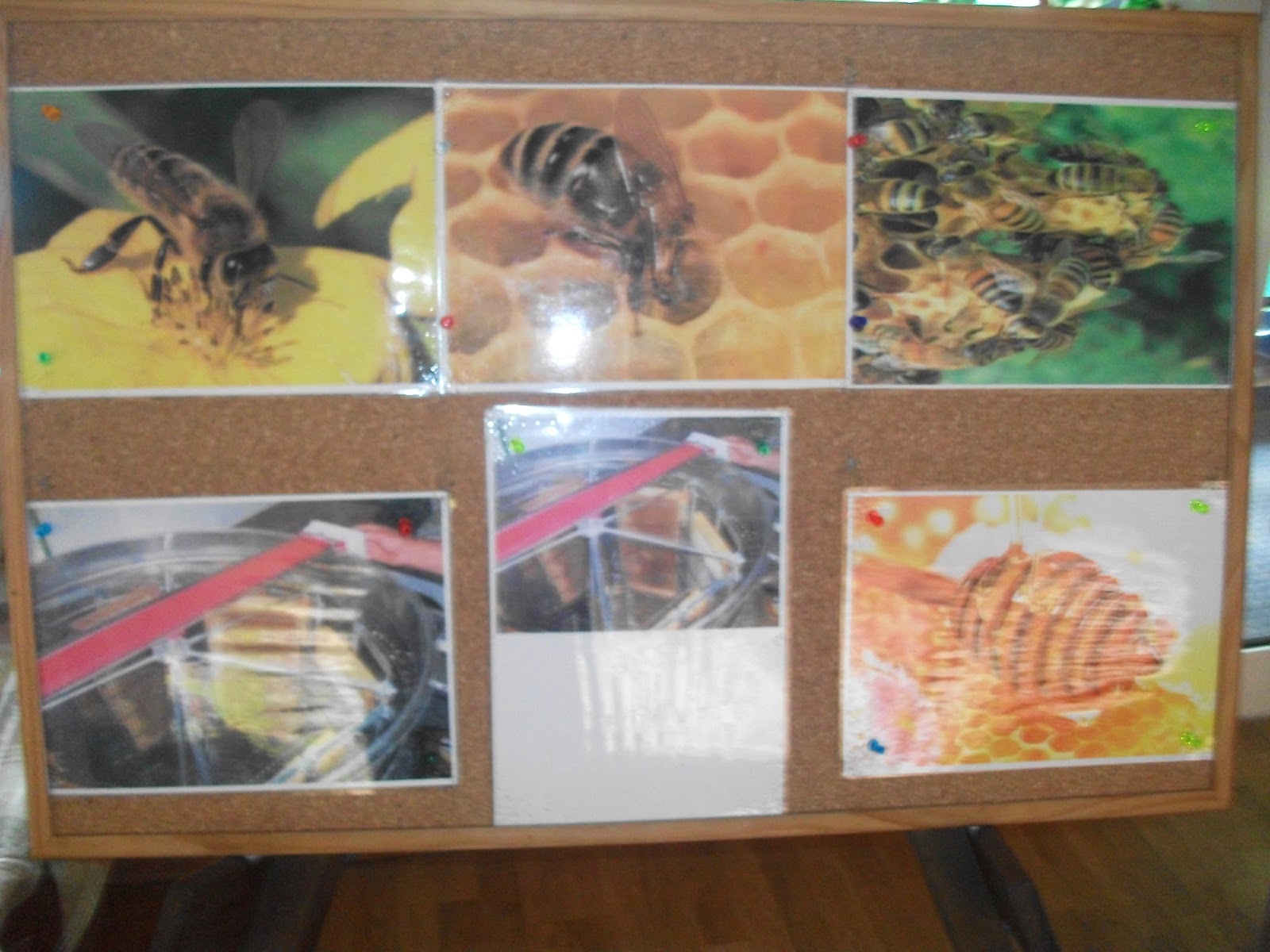 Στην αρχή μας έδειξε την κυψέλη...και η νέα πληροφορία που πήραμε ήταν ότι στις μέλισσες δίνουν μια βάση για αρχή. Κι αυτό γιατί αν αφήσουν τη μέλισσα μόνη της, κάνει μεγάλα κελιά- εξάγωνα. Και στα μεγάλα κελιά γεννιούνται κηφήνες!!! Ενώ στα μικρά κελιά γεννιούνται εργάτριες, οι οποίες και παράγουν το μέλι....
