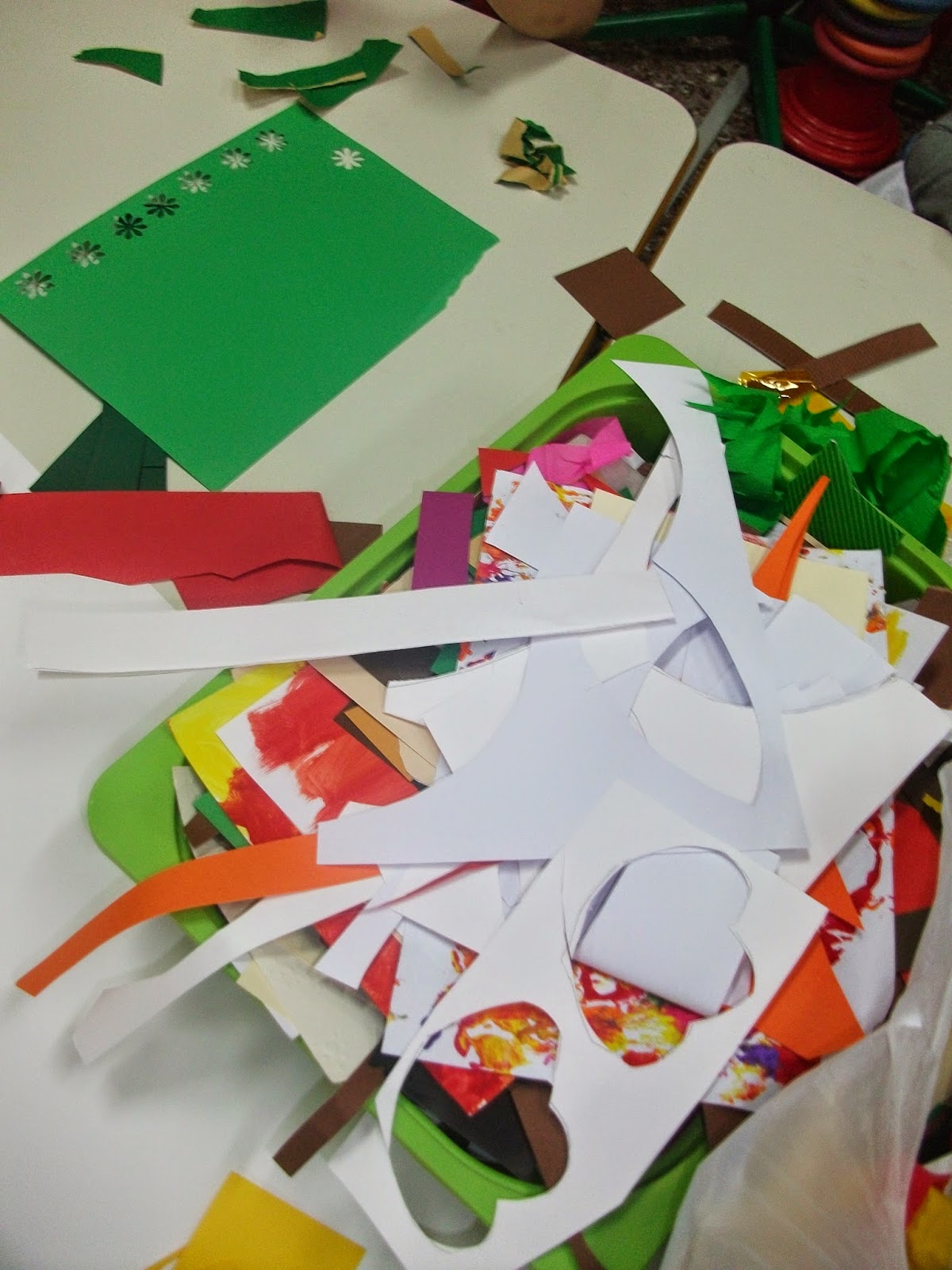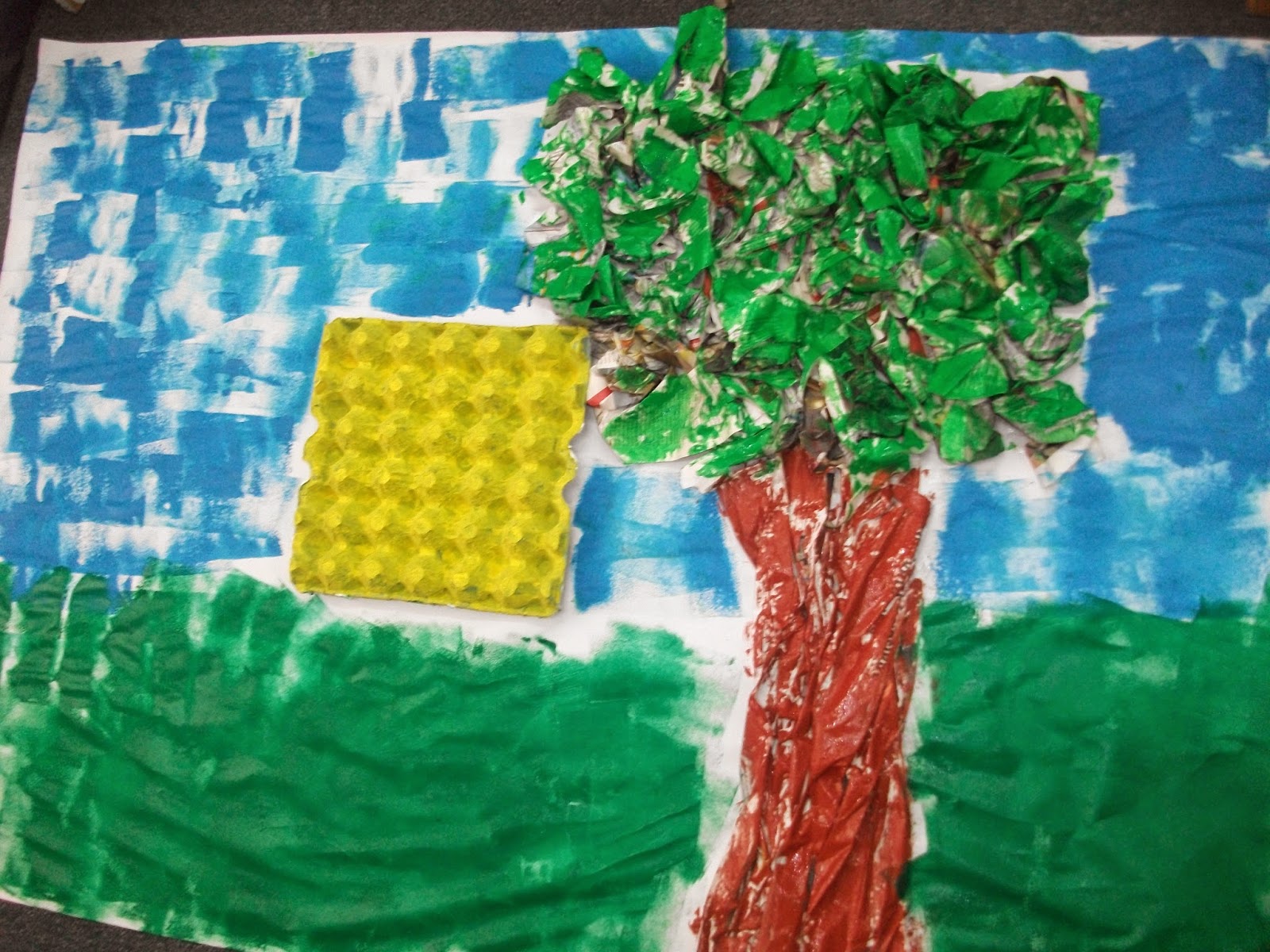 Κάποια παιδιά χρωμάτισαν το δέντρο, άλλα τον ουρανό και άλλα τα χόρτα. Στο τέλος κάναμε τη σύνθεση και στολίσαμε τον έναν από τους πίνακές μας...