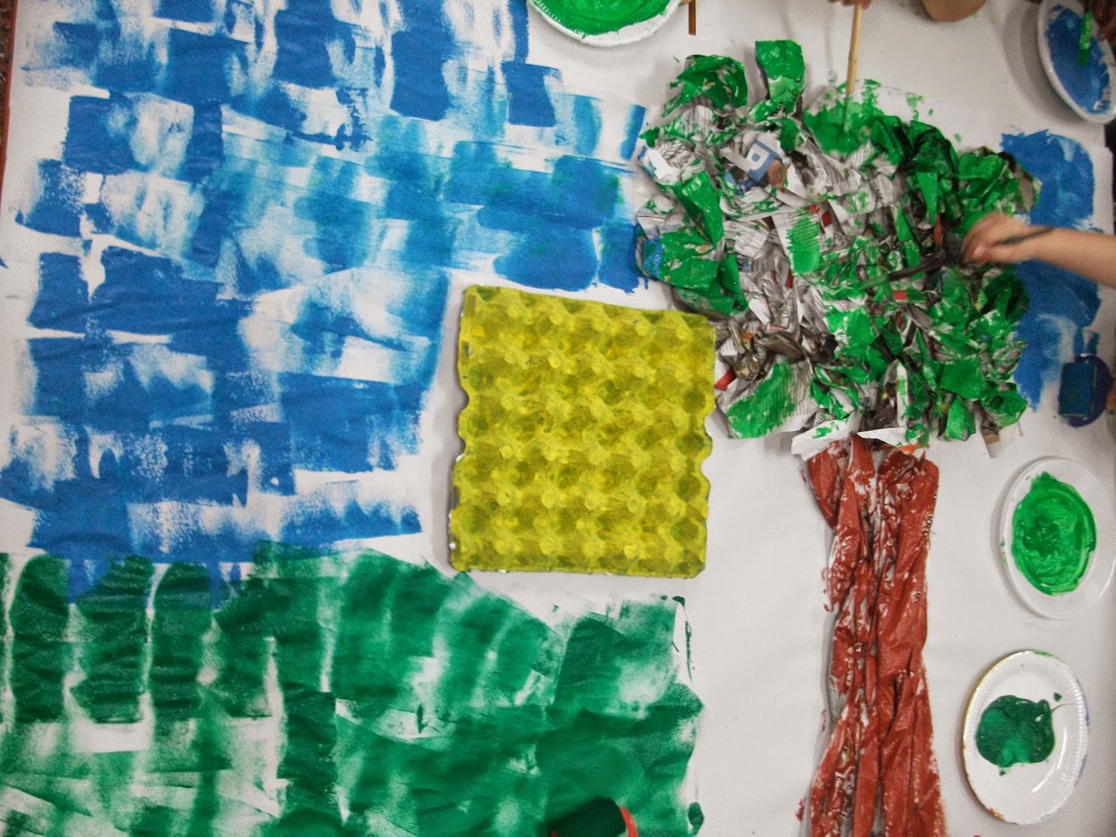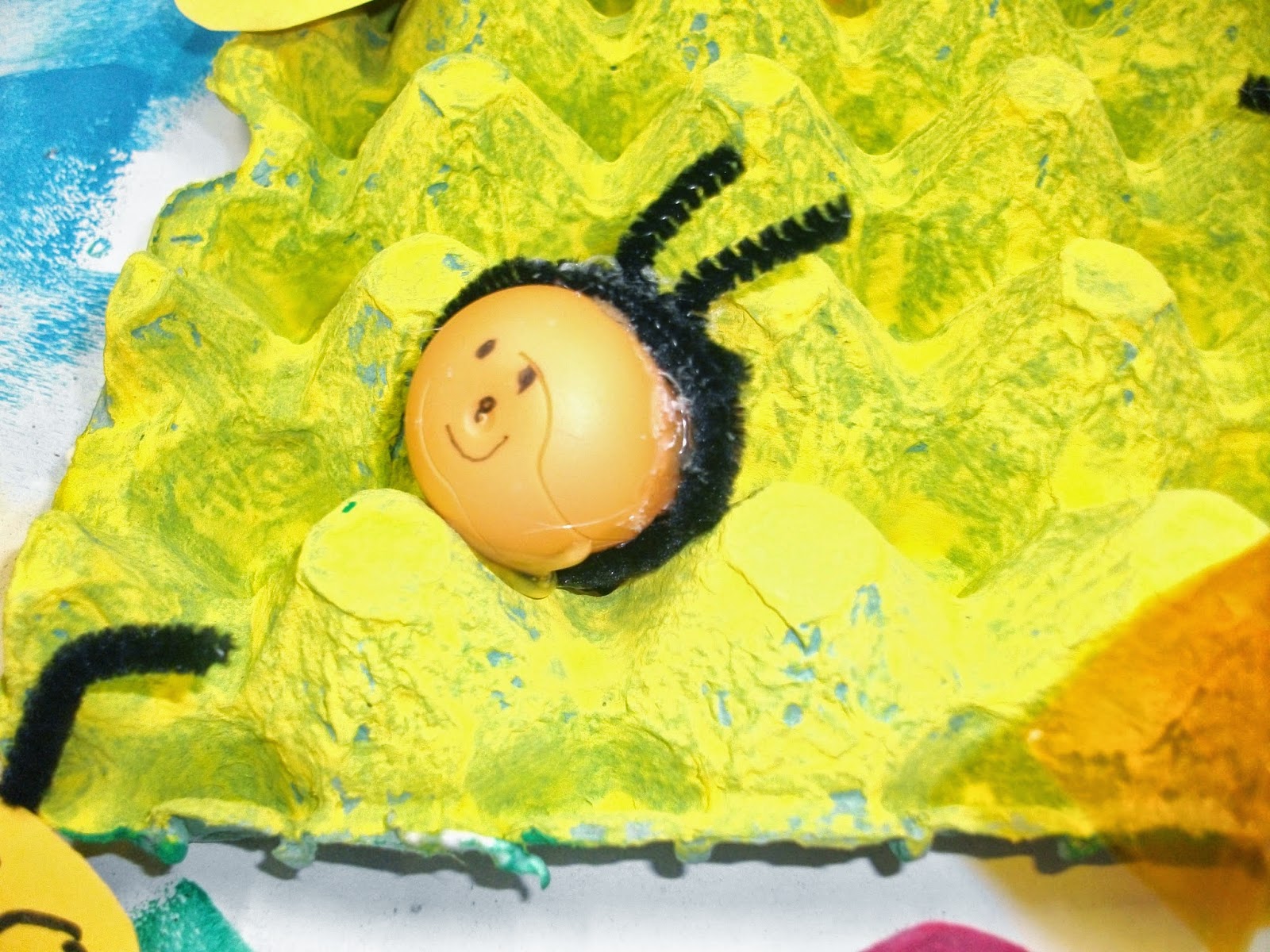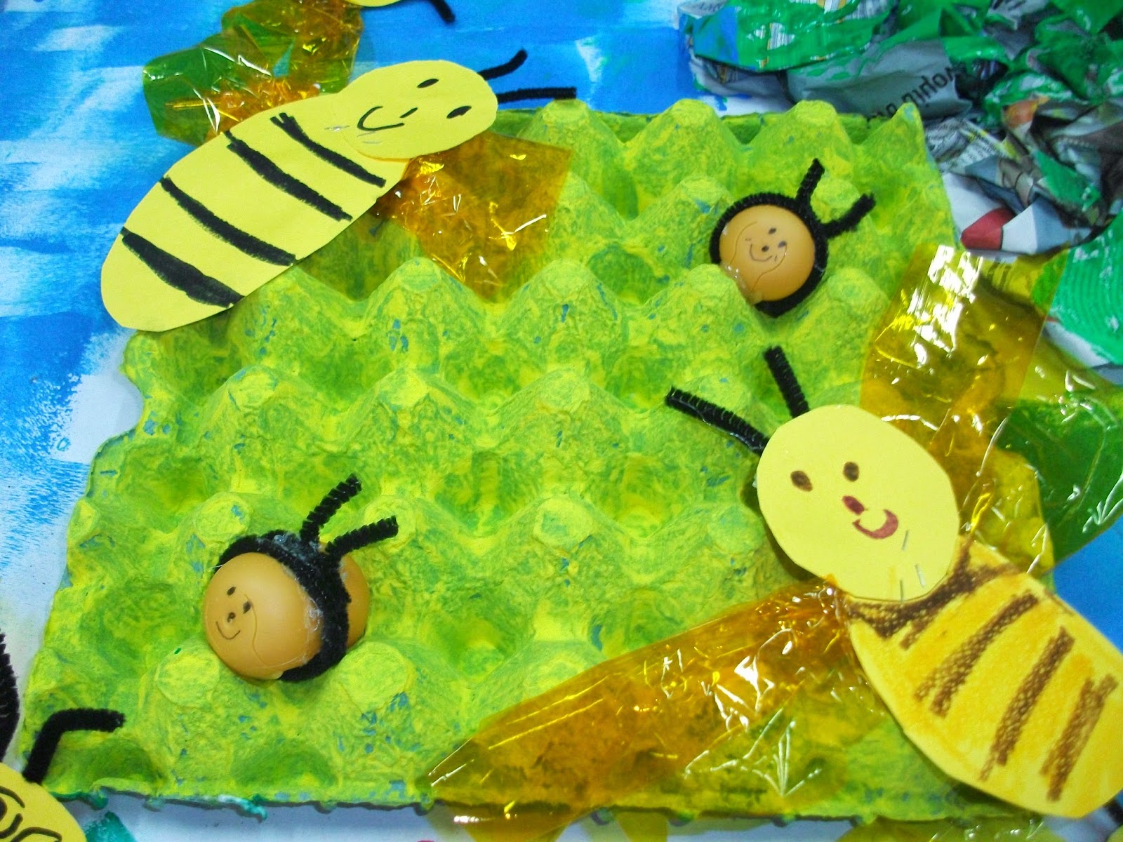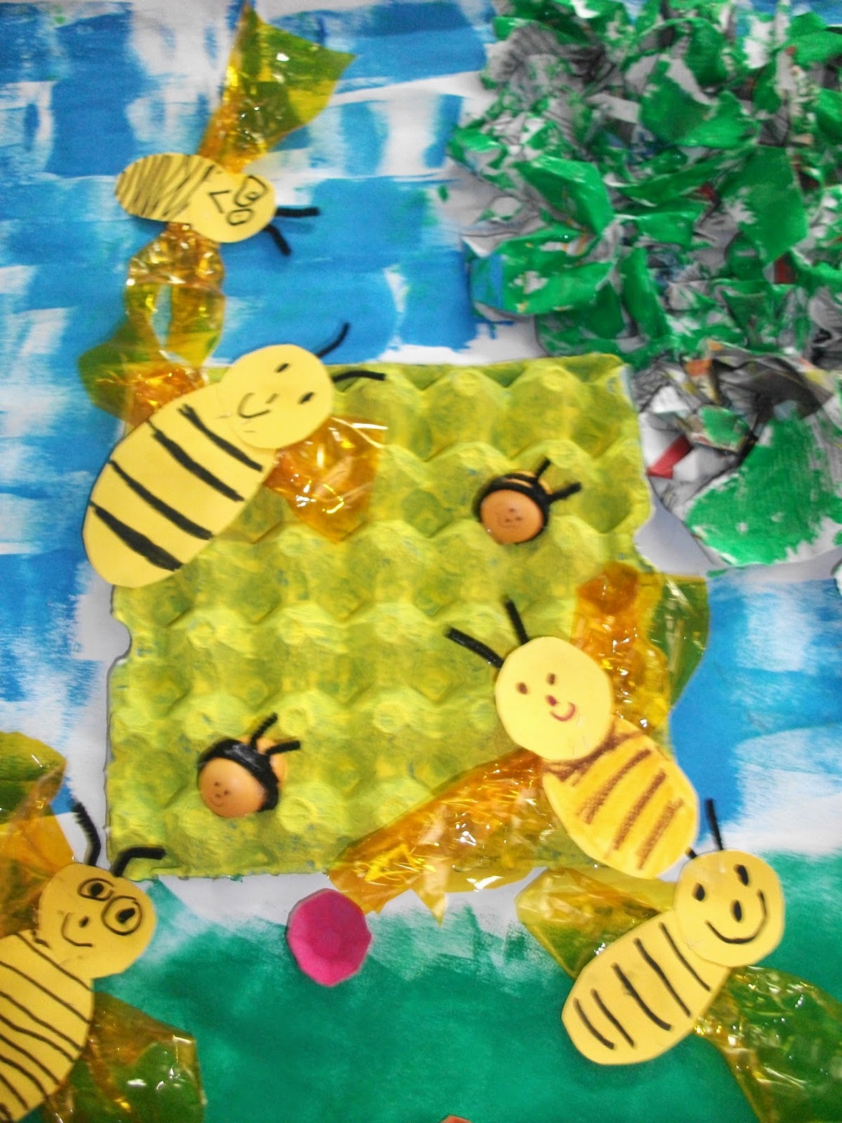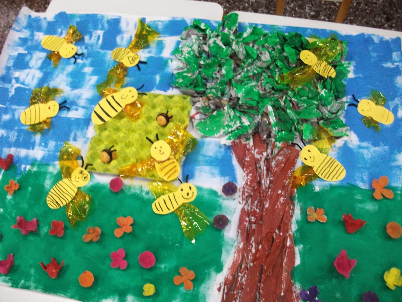 Μιλώντας για το μελι - μέλισσα, φτιάξαμε την ομαδική εργασία που ακολουθεί. Τσαλακώσαμε εφημερίδες και τις κολλήσαμε σε χαρτί του μέτρου με ατλακόλ σε σχήμα δέντρου. Άλλη ομάδα έβαψε αυγοθήκες κίτρινες, για κυψέλες. Όλοι έκαναν μέλισσες από χαρτόνι με φτερά από ζελατίνη. Άλλοι έβαψαν αυγοθήκες και κάναμε διαφορετικά λουλούδια σε σχήματα και χρώματα. Στο τέλος, κάναμε και δυο μελισσούλες από kinder αυγουλάκια.