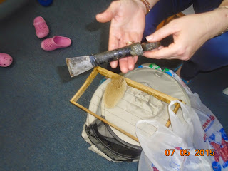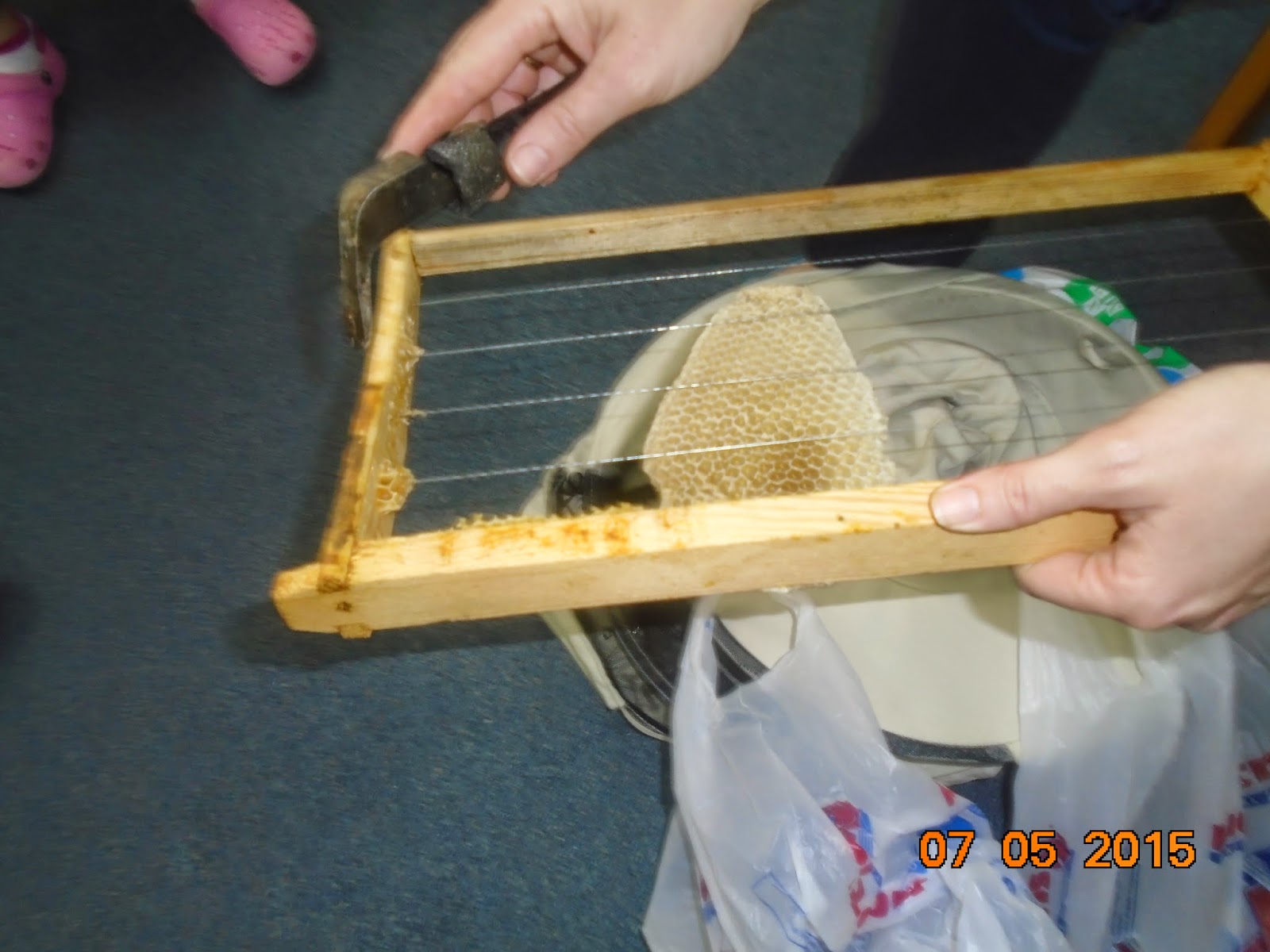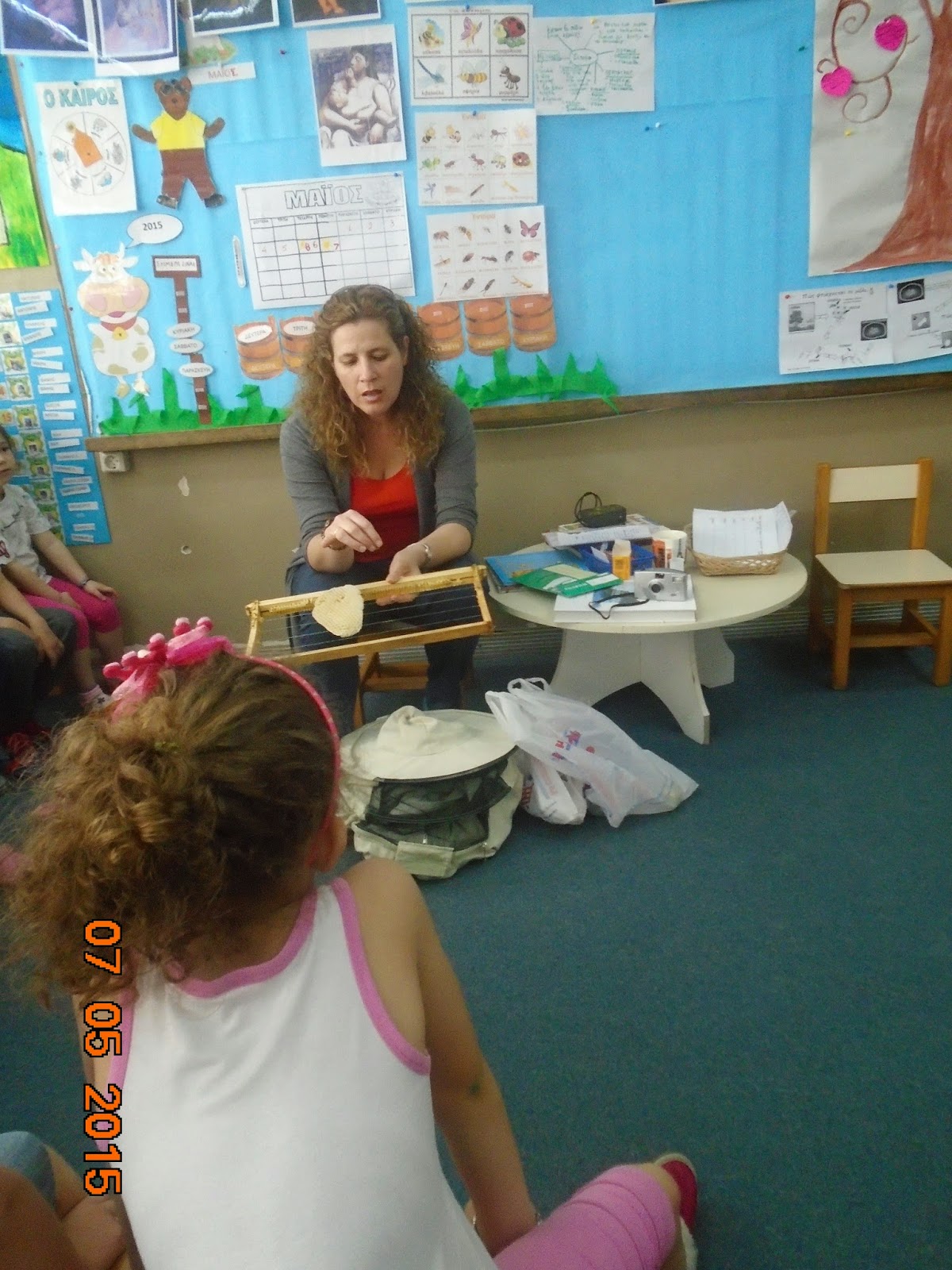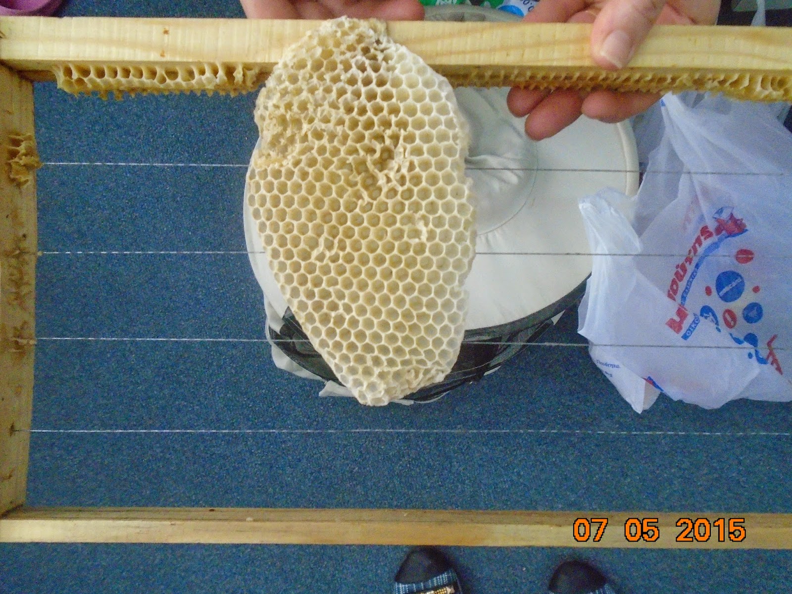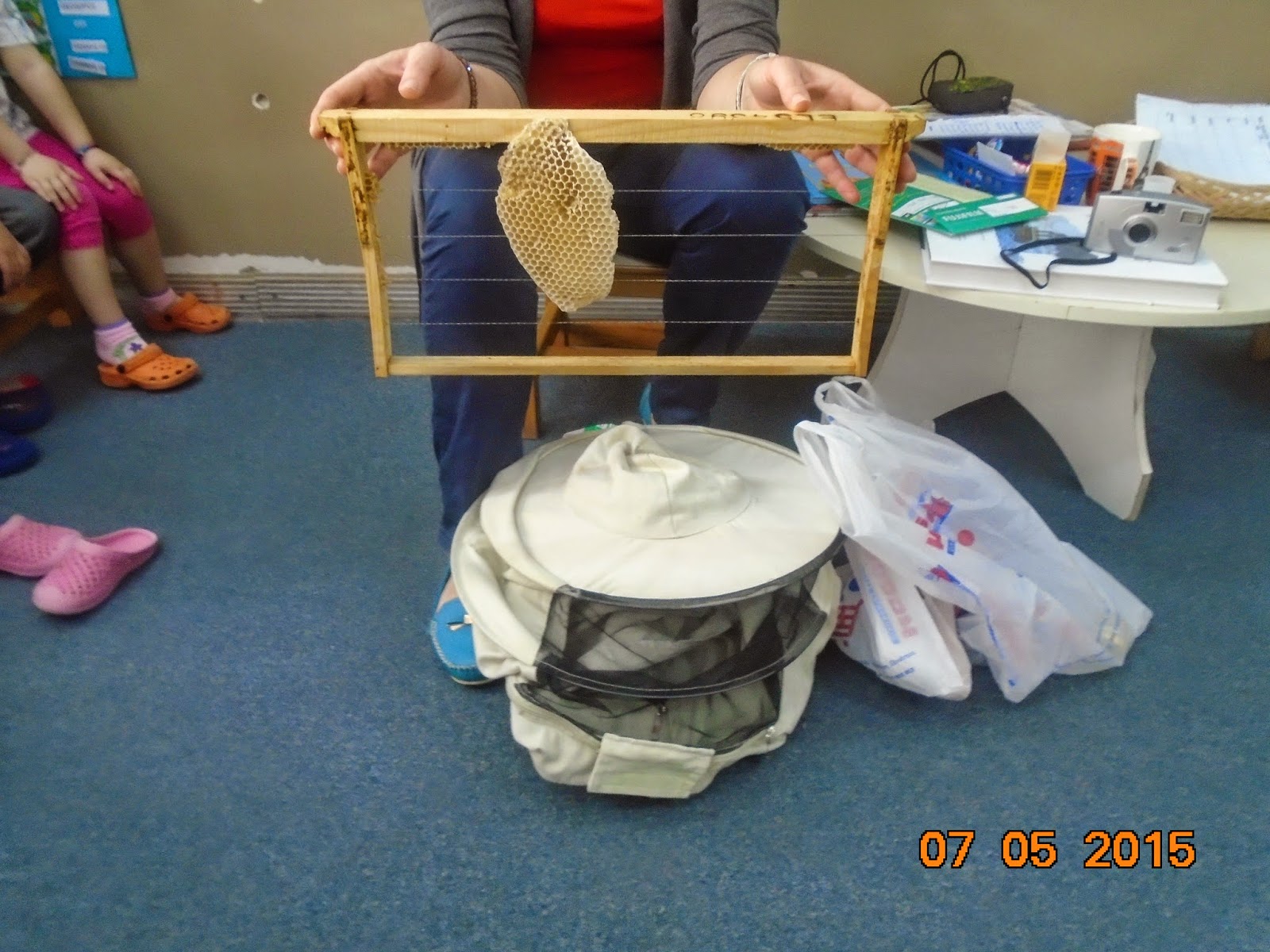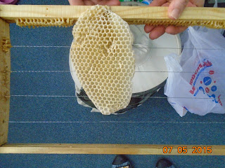Στην αρχή μας έδειξε την κυψέλη...και η νέα πληροφορία που πήραμε ήταν ότι στις μέλισσες δίνουν μια βάση για αρχή. Κι αυτό γιατί αν αφήσουν τη μέλισσα μόνη της, κάνει μεγάλα κελιά- εξάγωνα. Και στα μεγάλα κελιά γεννιούνται κηφήνες!!! Ενώ στα μικρά κελιά γεννιούνται εργάτριες, οι οποίες και παράγουν το μέλι....