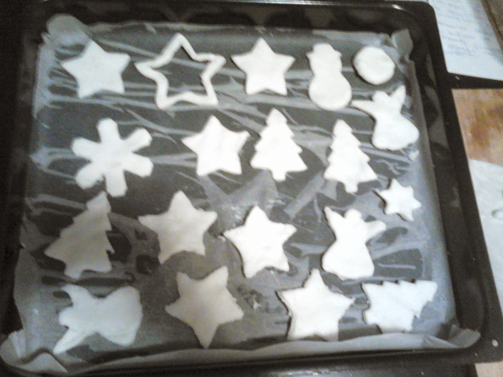 Μόλις κρυώσει τελείως το ζυμάρι μας, ανοίγουμε φύλλο και κόβουμε σχεδιάκια... Δουλεύουμε πάνω σε λαδόκολλα και εκεί τα αφήνουμε να στεγνώσουν μόνα τους στον αέρα για αρκετές μέρες. Τα γυρίζουμε πλευρά ανά 2-3 ώρες, αν μπορούμε, έτσι ώστε να στεγνώσουν και από τις δύο πλευρές. Όσο είναι ακόμη νωπά, ανοίγουμε μια μικρή τρυπούλα, για να μπορέσουμε να περάσουμε κορδονάκι στα στολίδια μας. Όταν στεγνώσουν εντελώς, γίνονται λευκά και κοκαλώνουν.