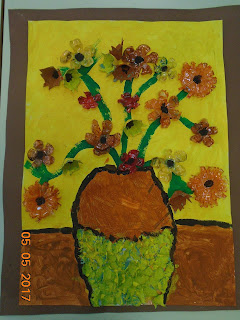 Με τα "Ηλιοτρόπια" του Βίνσεντ Βαν Γκογκ ασχοληθήκαμε αυτές τις ημέρες. Και παίρνοντας αφόρμηση από τον γνωστό πίνακα,  κάναμε έναν δικό μας , ομαδικό πίνακα σε χαρτόνι 50 x70 . Με αυγοθήκες και ατλακόλ τα παιδιά έντυσαν το κάτω μισό του βάζου και με κομμάτια εφημερίδας το πάνω μέρος του βάζου. Με αυγοθήκες και πάτους  από πλαστικά μπουκάλια νερού κατασκευάσαμε λουλούδια και τα έβαψαν τα παιδιά σε γήινα χρώματα.